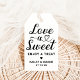 Elegante Hochzeitsfavoriten-Tags sind mit einem modernen schwarzen Herz-Kalligraphie-Skript "Liebe ist süß" gestaltet, zusammen mit einem stilvollen Minimalmonogramm der Braut- und Bräutigam-Vornamen, dem Hochzeitstag und der personalisierten "Genießen Sie eine Leckerei"-Nachricht. Das rustikale Kraftpapier-Etikett kann in weiß umgeändert werden und die Farben können komplett angepasst werden, um sich mit Ihrem Hochzeitfarbschema abzustimmen.