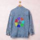Diese phantastische Denim-Jacke zeichnet sich durch ein digital kreiertes Bild eines Kreises von Lieben-Herzen aus. Jedes Herz ist eine andere Farbe des Regenbogens. Rot, orange, gelb, grün, blau, indigo und violett sind eine lustige Möglichkeit, Ihre Liebe für einen Freund, eine Freundin, einen Ehemann oder eine Ehefrau zu äußern. Der schwarze Text in der Mitte des Herzkreises lautet: "Liebe ist farbenblind" und feiert die Liebe zwischen Menschen verschiedener Rassen.