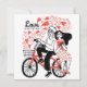 Eine skurrile Abbildung eines Paares auf einem Fahrrad, die Freude und Zuneigung ausstrahlt. Der Mann, der einen spielerischen Ausdruck trägt, greift die Lenker an, während sich die Frau, in einem karierten Kleid gekleidet, gegen ihn lehnt, ihre Hände in Vergnügen klatschten.