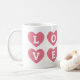 Dieses Design zeigt rosa Herzen mit dem Wort Liebe auf der einen Seite der Tasse und Sie können die andere Seite mit Namen anpassen.