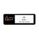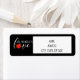 Dieses Label wurde mit Typ entwickelt. Der Hintergrund ist schwarz mit einem weißen Kasten, für die Adresse. An die links, der weißen Box; das Wort "Liebe" in einem weißen Skripttext. Es gibt ein rotes Herz, wo das "o" ist. Über "Liebe" stehen die Worte "Alles, was SIE brauchen, ist ".