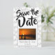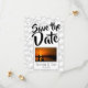 Eine lustige Save the Date-Karte mit einem stilvollen Script-Schriftart kombiniert mit einem modernen serifenlosen Schriftart. Liebe ist im Hintergrund grau geschrieben.