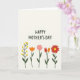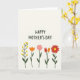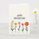 Diese Grußkarte zeigt eine große, freundliche Botschaft, die über die obere Hälfte verteilt ist und in dunkler Schrift geschrieben ist, die sich vor einem hellen cremefarbenen Hintergrund abhebt. Der offene Raum um die Wörter gibt dem Design Raum zum Atmen, wie eine stille Pause vor einer warmen Umarmung ❤️. Unter dem Text reihen sich fünf stilisierte Blumen in einer sanften Reihe auf, ihre ordentlichen Formen und weichen Umrisse deuten auf eine süße Nähe hin, wie Freunde, die Seite an Seite gehen. Die Reihe beginnt mit einem verzweigten Stiel, der mit kleinen runden gelben Blüten gepunktet ist, gefolgt von einer einzelnen orangefarbenen, becherförmigen Blume. Als nächstes kommt eine weiche rosa Blume mit vielen Blütenblättern, dann zwei spitz zulaufende Blüten in tiefem Rot und Orange, die einander zugeneigt sind, als ob sie ein Geheimnis teilen 🌼. Dunkelgrüne Stiele und