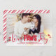 Urlaubskarte mit einem Liebe Päws Joy Pun in zauberhaften roten Schriftart geschrieben, mit Pfotendrucken und Herz dekoriert. Fügen Sie ein Foto von sich und Ihren Haustieren, oder nur von Ihren Haustieren, und Ihren Namen. Die Rückseite ist mit Pfefferminzstreifen versehen.
