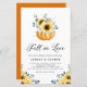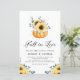 Fall in Liebe! Dieses Herbst Thema Probe Dinner Einladung bietet Wasserfarbenkürbis mit gelben Sonnenblumen, Baumwolle und Eukalyptus-Blätter. Personalisieren Sie diese durch Hinzufügen von Namen, Datum, Uhrzeit, Veranstaltungsort und anderen Veranstaltungsdetails. Diese rustikale Sonnenblume lädt zu Herbst- oder Herbsthochzeiten ein.