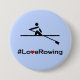 Mit einem Piktogramm eines Single-Ruders und dem Hashtag-Slogan #LoveRowing ist dies ein lustiger Knopf für einen scharfen Ruder. Der Hintergrund ist blassblau, und das "V" der Liebe wurde in ein rotes Herz verwandelt.