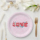 Papier Teller mit Liebe geschrieben in einem kühnen Schriftart im Blockstil umgeben von schönen Blume. Erschaffen mit Aquarellen. Hellrosa gemusterter Hintergrund.