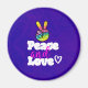 Ein funky cooler Magnet mit Ruhe und Liebe, geschrieben in einem großartigen typografischen Schriftart. Die Illustration ist ein handförmiges Friedenssymbol, die Finger in der klassischen v-Zeichen alle in Regenbogenfarben. Ein kleines doodle Herz neben dem Wort Liebe. Psychedelisches Groovy Design. Säurefreier lila Hintergrund.