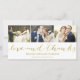 Diese einfache und schicke 3-Foto Hochzeitskarte mit einer Collage mit whimsical Script-Schrift, die Ihre Lieblings-Hochzeitsfeier Fotos hervorhebt. Bitte beachten Sie, dass es sich nicht um metallische Goldfolie handelt, die flach gedruckt wird.