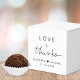 Moderne Gastgeschenk Hochzeit Box mit "Liebe + Dank" in einfacher Typografie und einem schicken Skript, Ihre Namen durch ein Herz und Ihr Hochzeitstag verbunden.