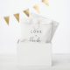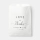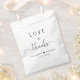 Elegante weiße Gunsttaschen für Ihre Hochzeitsgäste mit "Liebe + Dank" in schlichter moderner Typografie und einem stilvollen Drehbuch mit Wimpern, Ihren Vornamen verbunden durch ein Herz und Ihr Hochzeitsdatum.