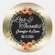 Romantischer Blumenkranz in Aquarellfarben dank Goldkleber in der Gastgeschenk Hochzeit - Metallischer goldener Hintergrund rund um die Ränder. In der Mitte ist ein schwarzer Kreis, der Liebe & dank in elegantem weißem Schriftsatz liest. Braut- und Bräutigam-Namen in Drehbuch und Hochzeitdatum, die unter weiß gedruckt sind. Gerahmt durch den eleganten Blumenkranz in Rot, Orange, Korallen und Blau-Grün-Blätter. Romantische goldfarbene Aquarellkleber in Aquarellfarben, die sich perfekt für eine Frühjahrs- oder Sommergarten-Hochzeit eignen. Klicken Sie auf Anpassen, um Textfarben, Textgröße und Schriftart-Stile zu ändern.