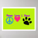 Niedliche Grafik in bunten Neonfarben. 3 Symbole - ein Friedenszeichen, ein Herz und eine Pfote, mit den Worten Frieden, Liebe und Pfoten. Für ruhige Haustierbesitzer.