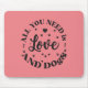 "Liebe und Hunde" Themed Maus Pad. : Ein"Liebe und Hunde" Themed Mouse Pad mit einer weißen kreisförmigen Grafik mit dem Satz "ALL YOU NEED IS LIEBE AND HUNDEN", hervorgehoben durch Herzen und Pfotendrucke. Dieses Themed Mouse Paditem "Liebe und Hunde" appelliert an Hundefreunde und fördert die Liebe als essenzielle Stimmung.