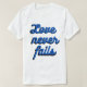 Nehmen Sie den Power der Liebe mit diesem zeitlosen Tee, der als Erinnerung dessen dient, was wirklich zählt. Mit dem gefühlvollen Ausdruck "Liebe Versage nie" strahlt dieses Design Positivität und Stärke aus und macht es perfekt für jeden, der an den dauerhaften Power von Liebe, Hoffnung und Mitgefühl glaubt.