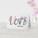 Liebe Text mit Blumen auf weiß gekalktem Holzboden für Hochzeitstag.