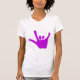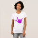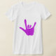 Zeichensprachhandsymbol, das handprint, für i-Liebe werden Sie, erfolgt in Lila, auf T-Shirts gedruckt.