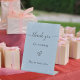 Ein staubblauer Hintergrund mit Imitaten, silbernen Glitzern. Text: Danke, dass du gekommen bist. Nimm bitte eins.