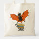 Ein niedlicher Fledermausliebhaber fliegt über einige Bücher und den Text "Meet me at the library".