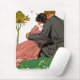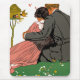 Vintage Mode-Illustration für ein Liebespaar, das sich vor einem Vogelhaus auf einem Feld umarmt.