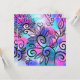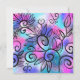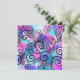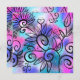 Ein lustiger kleiner Vogel in der oberen links Ecke und Blumenelemente auf einem rosa, lila und türkisfarbenen Hintergrund.