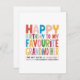 Dies ist eine Geburtstagskarte, die humorvoll sagt: "GLÜCKLICHER GEBURTSTAG ZU MEINEM LIEBLINGSGRANDMOTHER (die Tatsache, dass Sie meine einzige Großmutter sind, ist irrelevant)" Es ist ein spielerisches und farbenfrohes Design, das Wort: "GLÜCKLICHER GEBURTSTAG ZU MEINEM LIEBTEN GRANDMOTHER , wird in großen, bunten, spielerischen Blockbriefen mit einem Pastellfarben angezeigt Palette, wobei es sich als Mittelpunkt des Designs herausstellt.
