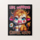 A funny and sarcastic design showcases a cute highland cow sitting with a beautiful white daisy and a to-go coffee cup. The cow, with big blue eyes and a serious expression, sports a lipstick kiss on his cheek and vibrant orange-and-white fur. The colorful text reads, "Life happens, coffee helps." This design is available on various products, making perfect gifts for coffee lovers.