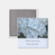 Elegante hellblaue Hydrangeas mit dunkelgrünem Blattakzent sparen den Dattelmagneten. Passen Sie die Namen der Braut und des Bräutigams und das besondere Datum an.