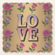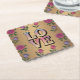 Dieser hübsche vergoldete Untersetzer zeichnet sich durch ein dekoratives Grafikdesign aus, bei dem das Wort LIEBE in großen Buchstaben mit einem Gradienteneffekt von hellblau bis rosa verwendet wird. Die Buchstaben sehen opaleszent aus und haben eine schwarze Kontur und einen schwarzen Schatten. Es gibt ein niedlich wiederholendes Muster rosa und lila Rose mit grünen Blätter auf goldenem Hintergrund. Die Rose wechseln sich zwischen rosa und lavendelfarbenen Farbtönen ab und schaffen ein sanftes, romantisches Ambiente. Der Untersetzer ist ein quadratischer Untersetzer aus geschossenem Papierhalbstoff. Das Untersetzer Set hat sechs Untersetzer.