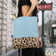 Its spacious design provides ample room to store all your essentials, such as books, a laptop, and personal items. The light blue color is fresh and versatile, while the leopard trim adds a bold and original touch, making it a true statement piece.