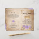 Entwerfen Sie Ihre eigenen lila Quinceanera-Programme in edlem Gold und Licht auf einem Vintagen, alten Scrollpapier DIY-Template. Es ist einfach, personalisierte Eventdetails mit dem Platz, den dieses gefaltete Blatt bietet, hinzuzufügen. Die einzigartige Aquarellblütenkunst von Raphaela Wilson zeigt Lavendel-Rose mit Imitaten metallische Goldakzente, eine königliche Prinzessenkrone / Tiara, funkelnde Konfetti-Glitzer-Schmetterlinge sowie luxuriöse Filigree-Ränder. Während die schicke Typografie im Beispiel zeigt Kalligraphie-Skript und moderne Schriftart, fühlen Sie sich frei, um den Stil zu bearbeiten. Das abgenutzte Pergament Papier ist so konzipiert, dass es in zwei Hälften gefaltet wird und ergänzt nicht nur eine lila und goldene rustikale Ranchera Quitte, sondern auch eine mexikanische, süße 16 Geburtstagsparty. Umforme sie für elegante Hochzeitsfeiern, u.a. für besondere Veranstaltungen, bei denen dieses einmal Vintage Märchendesign gefordert wird. Fügen Sie benutzerdefinierte Details wie Namen, Ort, Datum, Messe Zeremonie, Reihenfolge des Dienstes, das geehrte Party der Chambelanes / Damas, plus eine personalisierte Dankesnachricht. Wenn Sie es vorziehen, den Text auf ein Minimum behalten, gibt es Platz für ein glamouröses Mis Quince Anos Bild / Foto. Das personalisierte lila und goldene Quince-Programm kann lange nach der Feier als hochgeschätzter Sake gehalten werden. Viel Spaß! Kategorie: traditionelles Quinceañera Programm Zeitplan / XV Template Ideen; märchenhafte Prinzessin Hochzeit-Programm mit Schmetterling Konfetti, und Lavendel Aquarell Hochzeiten Programme. Gold und lavender quince Themenfarben: staubige, lila, lavendelfarbene, helle Lila, pastellfarbene Violette, Bräune, weiche Braun, gelbes Champagnergold, Schwarz und Weiß.