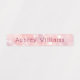 Name labels featuring your name in maroon on a light pink, soft-focused background with glistening light bokeh.