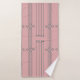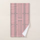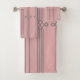 Cet ensemble de serviettes a un design art déco de lignes verticales avec des diamants et des cercles en argent sur un champ de rose.