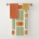 Ce kit de serviettes est doté d'un linge jaune, d'une serviette orange à la main et d'une serviette de bain au design moderne du milieu du siècle, composée de cinq lignes vertes et d'un rectangle arrondi doré, avec un rectangle arrondi orange répété à travers le design.