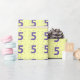 Es ist Zeit, das 5. Lebensjahr zu feiern! Die Nummer fünf ist lila gestrichen und hat lockige Hinweise, die sie umgeben. Es wird in einem Muster wiederholt und auf einem gelben Hintergrund auf dem Packpapier gedruckt. Die Hintergrundfarbe kann angepasst werden.