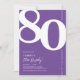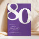 Eine lila und weiße 80. Geburtstagsfeier, die den Charme der alten Welt des fetten Serif-Schriftartes '80' nahtlos mit einer modernen, benutzerfreundlichen und personalisierbaren Vorlage verbindet. Diese Einladung ist nicht nur eine Karte, sie ist ein bedeutsamer Sake, um den Meilenstein von 80 zu schätzen.