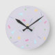 Super lustige 80er geometrische Wanduhr. Die Hauptfarbe ist ein blassgraues lila.