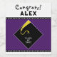 Kreative Abschluss-Geschenketiketten und Party-Dekoration mit klassischem Schwarz Graduierdeckel und Goldtassel-Design auf lila Hintergrund. So personalisieren Sie Text bearbeiten, um Name und Senior Class Year hinzuzufügen.