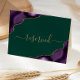 Diese elegante, moderne Hochzeitstisch-Platzkarte mit Sitzgelegenheiten bietet ein lila Aquarellbild, das mit goldenen Imitaten in den gegenüberliegenden Ecken bestickt wird. Das Wort "reserviert" erscheint in goldfarbenem Handschriftenskript mit Swashes vor und nach einem smaragdgrünen Hintergrund auf beiden Seiten der Karte.