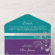 Dieses lila und aquamarine Hochzeitsalbum mit eleganten silbernen Blumenfolienakzenten, stilvoller Typografie und einer integrierten RSVP-Karte überzeugt durch eine moderne und glamouröse Atmosphäre. Die mutige Juwelentönpalette ist ideal für Herbst-, Winter- oder Abend-Hochzeiten. Die Vorderseite zeigt Ihre Namen und Veranstaltungsdetails, während der silberne Blumenbackofen einen Antwortbereich und die Vorlieben für das Essen beinhaltet. Personalisieren Sie mit Ihrer Hochzeitswebsite, Ort und Datum. Ideal für Paare, die ein luxuriöses und dennoch funktionales Format suchen. Bitte beachten Sie: Diese Einladung erfordert einen separaten Briefumschlag. Wir empfehlen die Verbindung mit einem A9-Umschlag (5,75" x 8,75") für die beste Passform.