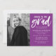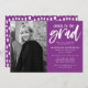 Wir laden Sie ein, den Absolventen mit unserem Applaus für die Graduiertenfeier zu feiern. Die moderne Graduiertenparty lädt das vertikale Foto des Absolventen auf den links ein. "Höhepunkt" wird in einem weißen, handgeschriebenen Pinselskript mit lila Hintergrund angezeigt. Personalisieren Sie die Vorderseite der Einladung, indem Sie den Namen des Absolventen, den Schulnamen, das Abschluss Jahr und das Party Details. Die Einladung kehrt um, um ein lila und weißes abstraktes Punktmuster anzuzeigen.