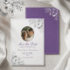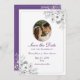 Verkünden Sie Ihre Hochzeit stilvoll mit dieser eleganten lila floralen "Save the Date"-Karte mit Foto, moderner Skript-Typografie und zarten Blumen in Linienart. Das saubere Layout hebt Ihr Bild schön hervor, während der lila Rahmen und die floralen Ecken eine romantische, zeitlose Note hinzufügen.