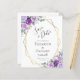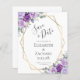 Diese elegante, moderne Hochzeit bewahrt die Dattelkarte mit einem geometrisch goldenen Rahmen, der mit lila und lila Blumenbouquets und Eukalyptusgrün auf weißem Hintergrund dekoriert ist. Der individuell anpassbare Text kombiniert kohlegraue, weißliche Handschrift, Kupferplatte und kursiven Schriftart. Die Rückseite ist weiß. (HINWEIS: Die Mittelansätze werden nicht automatisch in diese Haushaltseinladung aufgenommen. Um Umschläge zu Ihrer Bestellung hinzuzufügen, verwenden Sie bitte das Dropdown-Menü "Umschläge".)