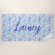 Dieses wunderschöne Strandtuch ist mit blauen, lila und grünen Aquarellbildern in blühendem Ambiente gestaltet. Personalisieren Sie mit Ihrem Namen oder einem Angebot.