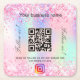 Rosa, lila, minzgrüner holografischer Hintergrund. Mit rosa Imitaten dekoriert, Glitzer Staub. Personalisieren Sie Ihren Firmennamen, Ihren eigenen qr-Code und fügen Sie ihn Ihrem Instagram-Konto hinzu. Mit dem Text x2: Folgen Sie uns!