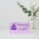 Elegant entworfene Visitenkarte für einen Kuchen-Dekorationsbetrieb, Backen, Bäckerei, Zuhause... Lila Staffelkuchen auf einem weichen lila diagonalen Streifen Hintergrund. Eine Grenze moderner lila Streifen betont den Boden. Passen Sie Ihre Daten auf Wunsch an.