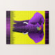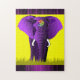 Lila Elefant mit OM-Symbol steht auf Gras mit einem gelben Hintergrund. Unterschätzen Sie nie einen Elefanten. Einige glauben, dass sie ein Symbol des Glücks sind