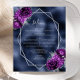 Dieses elegante, moderne Hochzeitsmenü besticht durch einen silbernen geometrischen Rahmen, der mit lila und silberfarbenen Blumenbouquets aus Pflaume auf einem Hintergrund mit blauen Imitaten dekoriert ist. Der anpassbare Text kombiniert silbergraue, weißliche Handschrift, Kupferplatte und kursiven Schriftart.