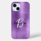 Dieses elegante personalisierte Handy verfügt über ein Monogramm und einen Vornamen in modernem Schwarz-Weiß-Drehbuch auf einem lila, gebürsteten Metallhintergrund.