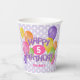 Diese lustigen und farbenfrohen Geburtstagsfeier-Tassen enthalten die Meldung "Happy Birthday", die in realistischen, skurrilen, lila, mattierten Ausschnitt-Cookies, umgeben von mehrfarbigen Ballons - Kinderalter und Name können personalisiert sein - Hintergrund ist ein Muster kleiner weißer Polka-Punkte auf blasser lila - von katz_d_zynes